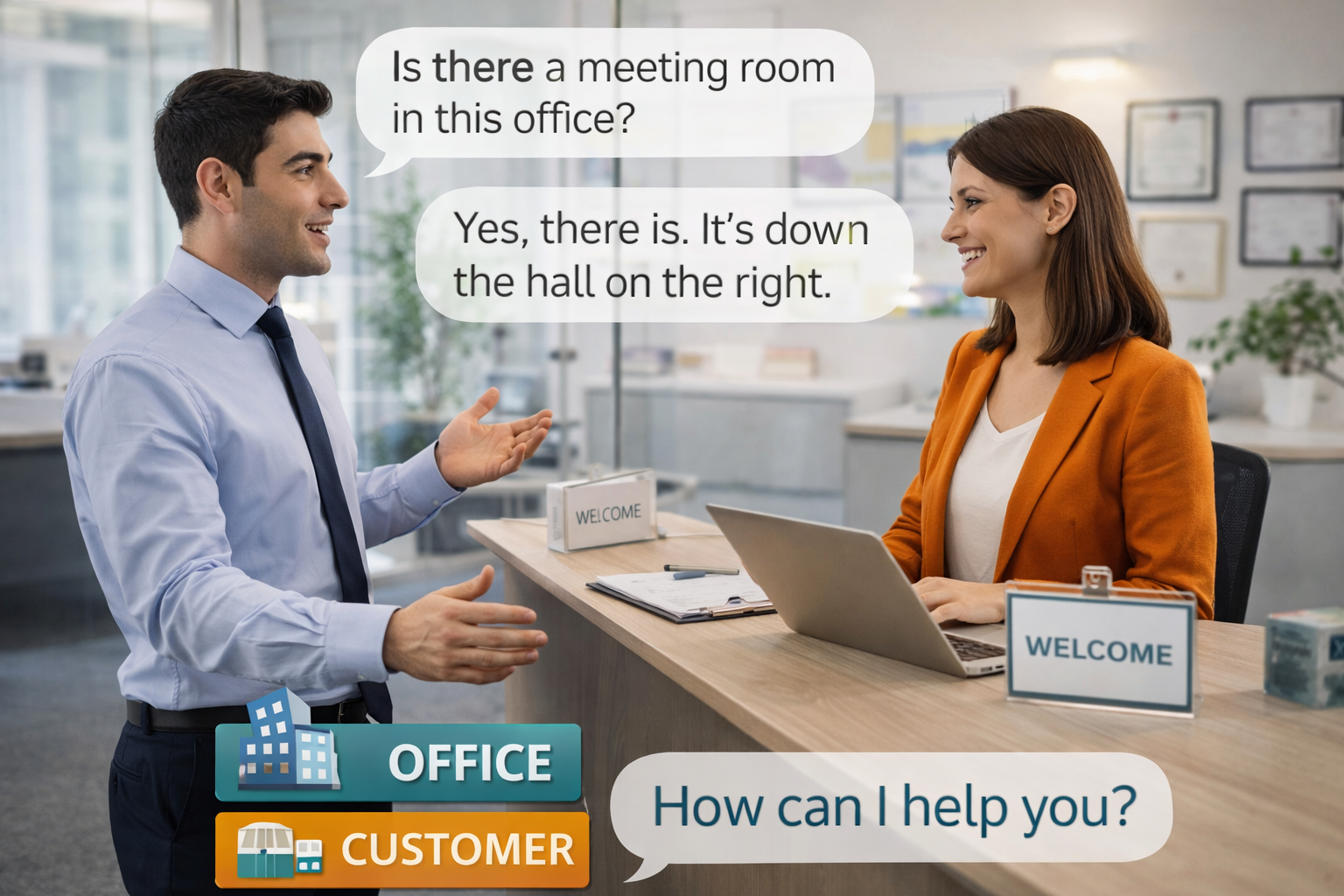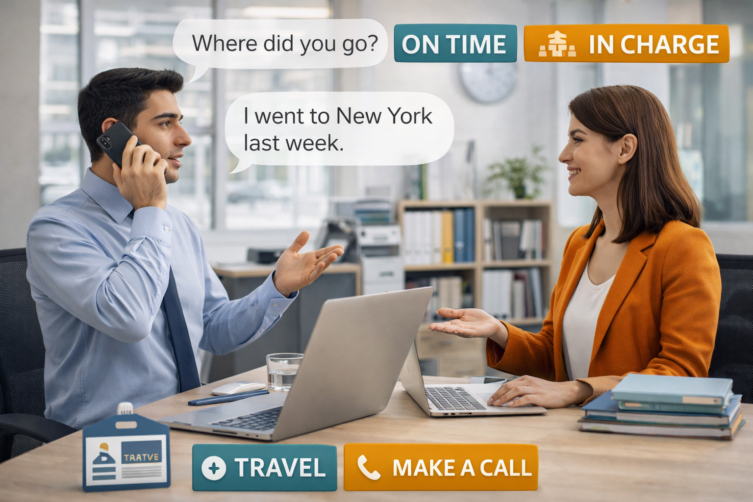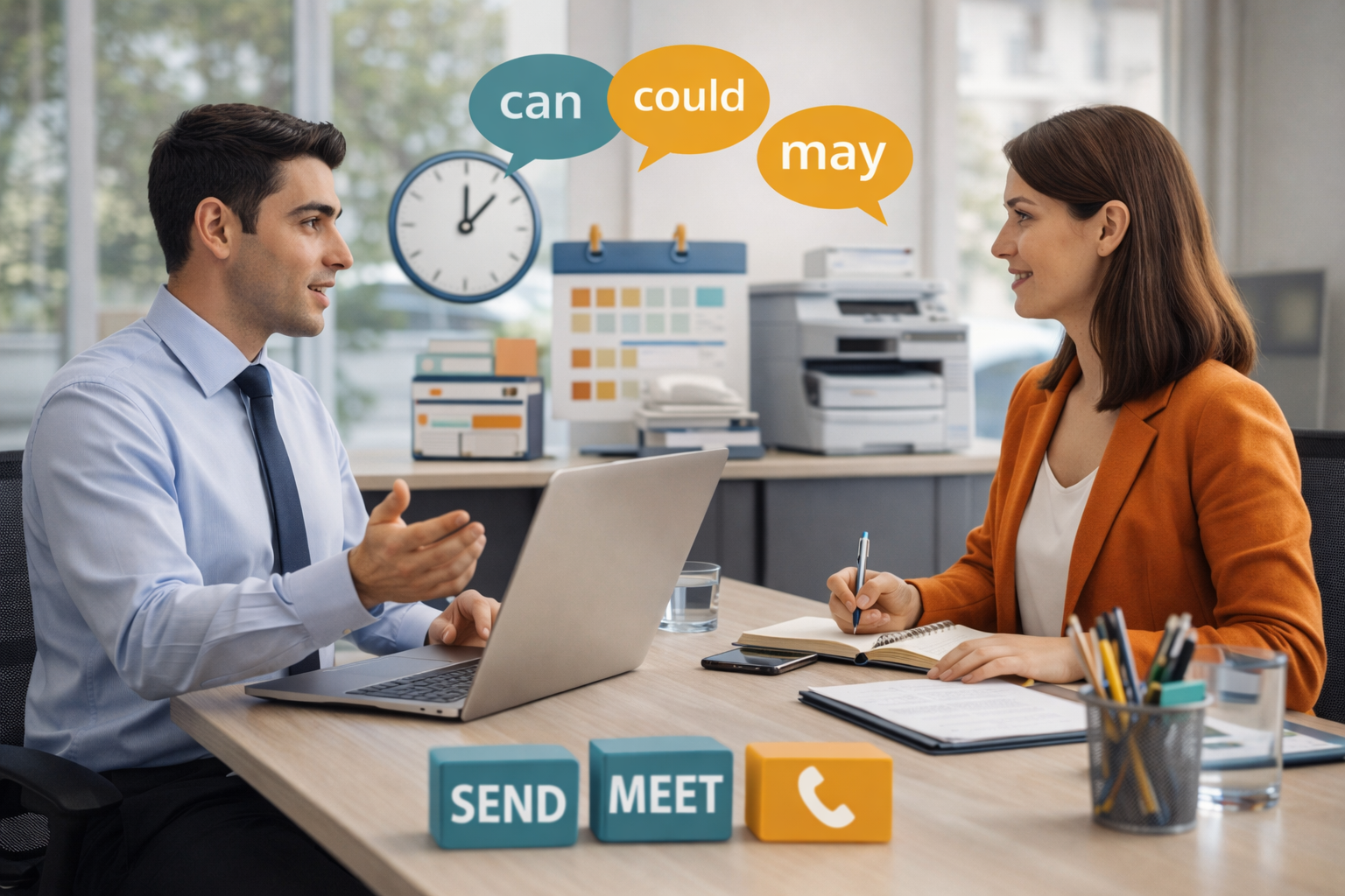 Vocabulary: office equipment, meetings, common verbs (send, call, meet)